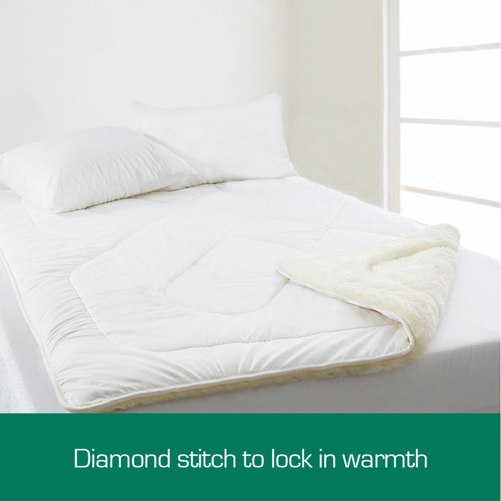 This beautifully constructed underblanket is fully reversible, designed for your absolute comfort. You can sleep on the wool side in the Winter and the japara cotton side in the Summer. Because wool is natures own insulator, it is warm in the Winter and cool in the Summer. A great Aussie product.