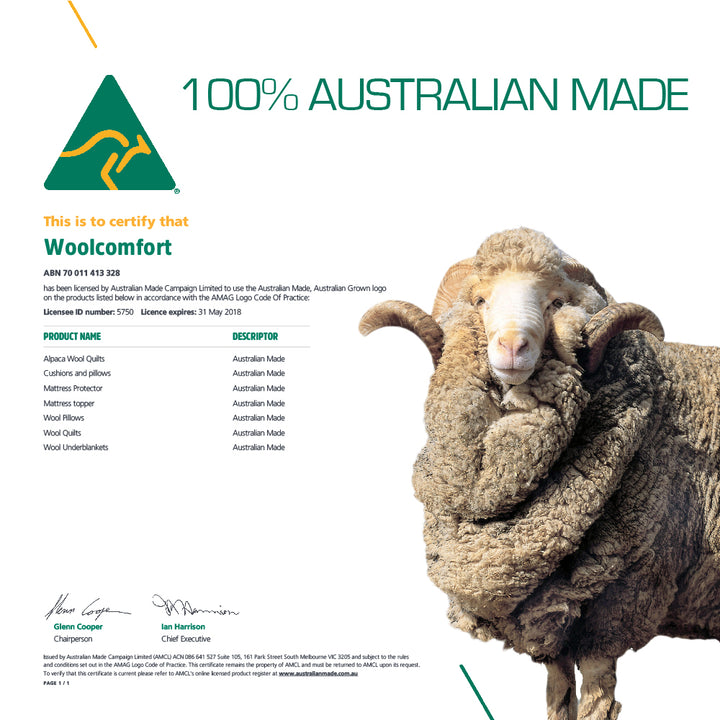 Our Woolmark Certified Wool Pillow is filled with 100 percent Pure New Australian Wool to provide a perfect nights sleep in all sleep positions. Just the right thickness in 900 Grams and sateen cotton casing. Dust-free and odourless. Measures 45 cm width 70 cm length Standard pillow size.